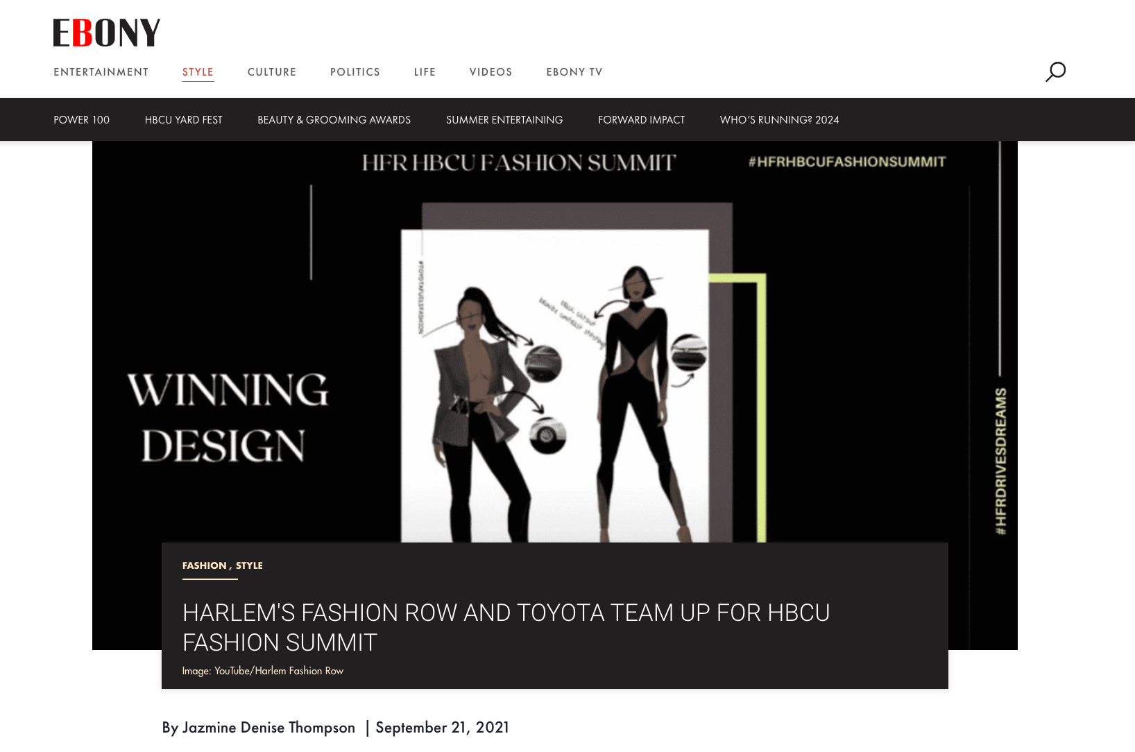 In 2021, Harlem's Fashion Row (HFR) partnered with Toyota and The Dream Project for their annual HBCU summit. A segment of the summit was dedicated to HBCU designers, who participated in a challenge for a chance to win a grant of $2,500. The designs had to be inspired the 2022 Toyota Corolla XSE Apex, or the 2021 Rav XSE Hybrid.