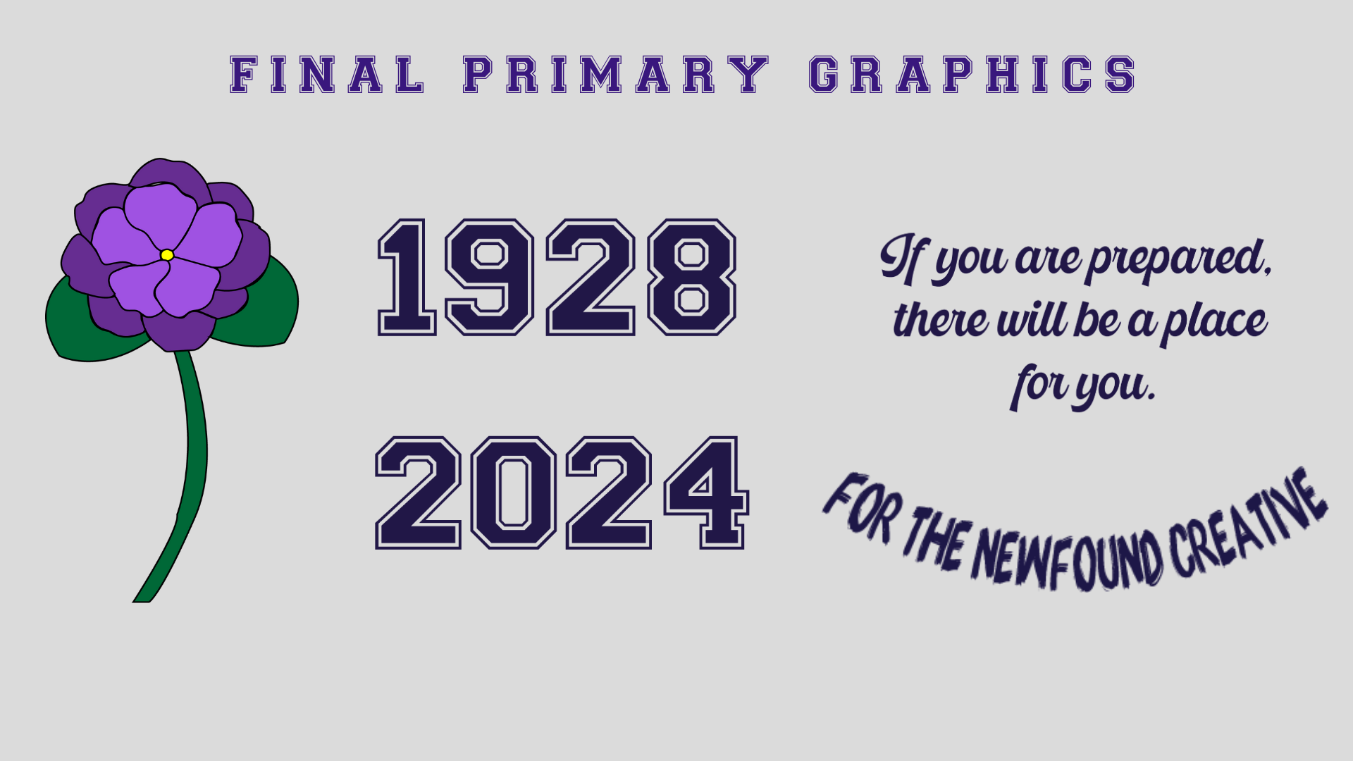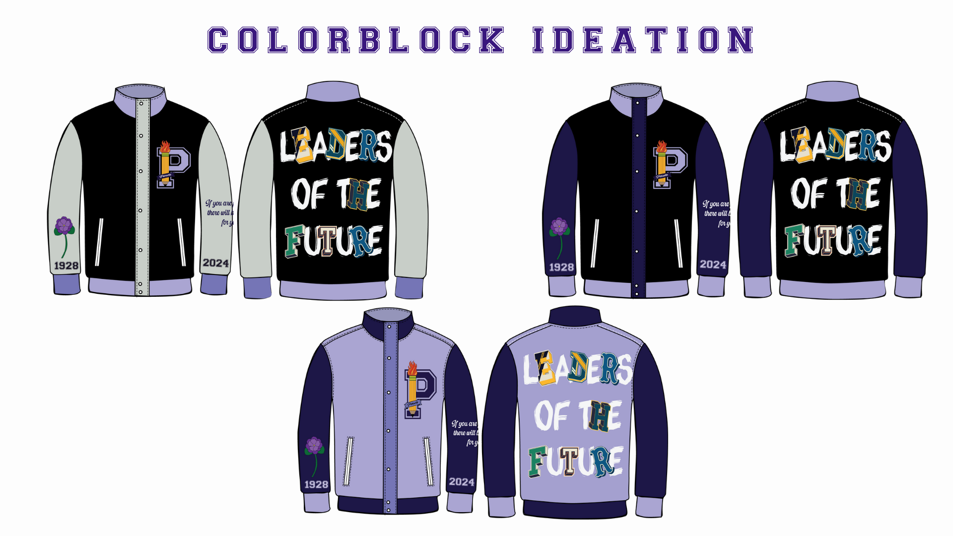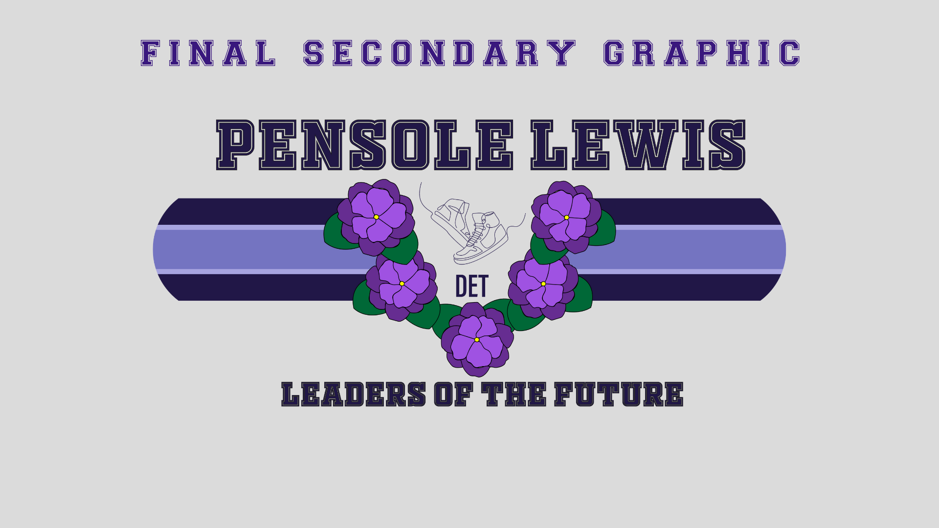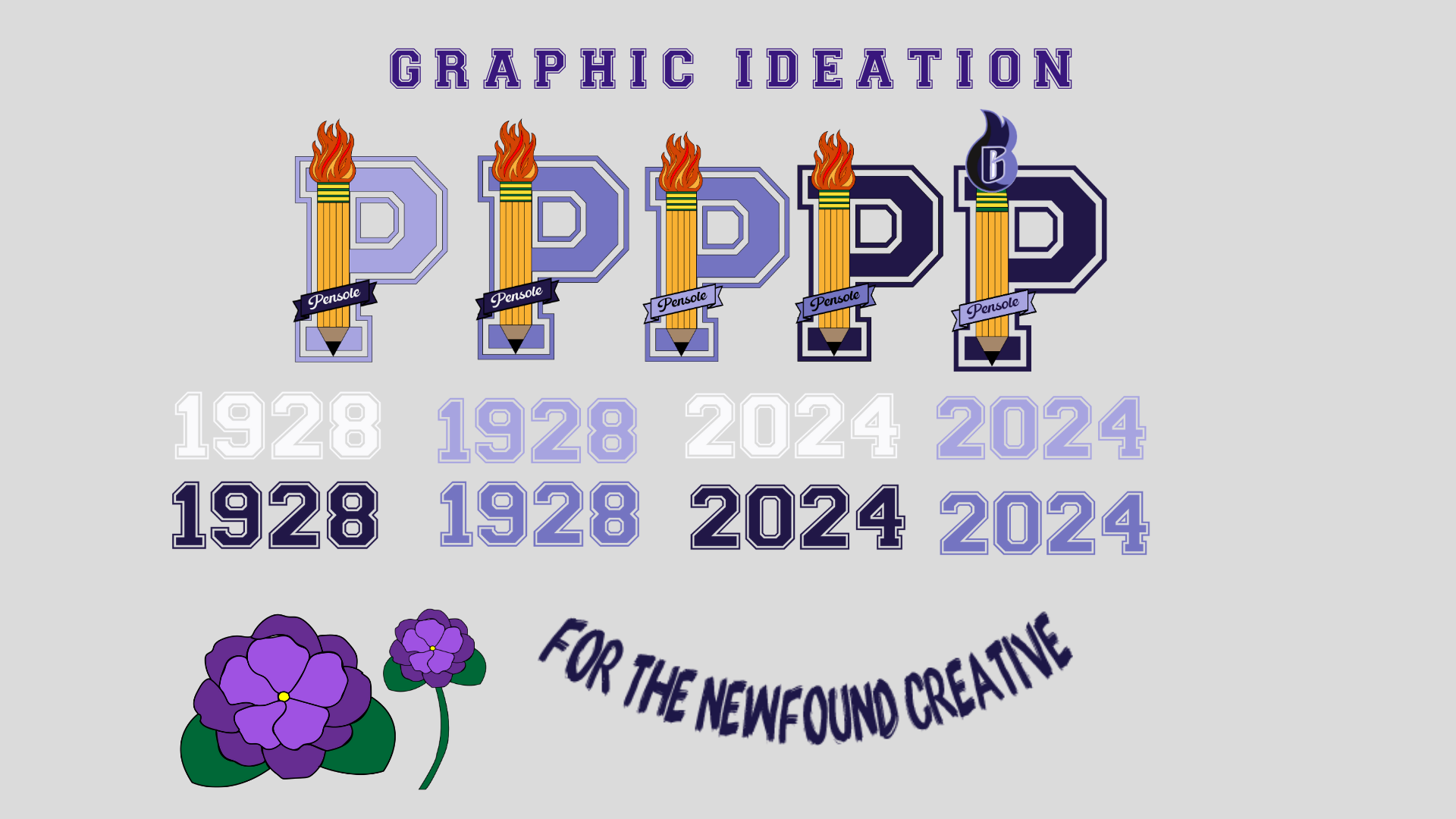 I decided to go with the preppy graphic concept. In doing so, I knew that I wanted to modernize the old Pensole Academy logo, and find a way to incorporate the idea of flames/lights – as an ode to Blacklights and being trailblazers. 1928 and 2024 represent Lewis College of Business and PLC Detroit, violets are in honor of Dr. Violet T. Lewis.