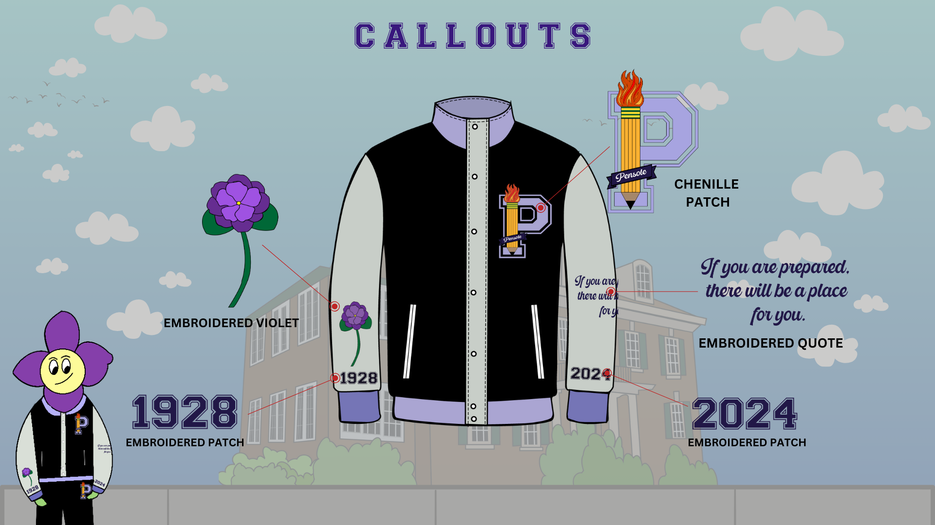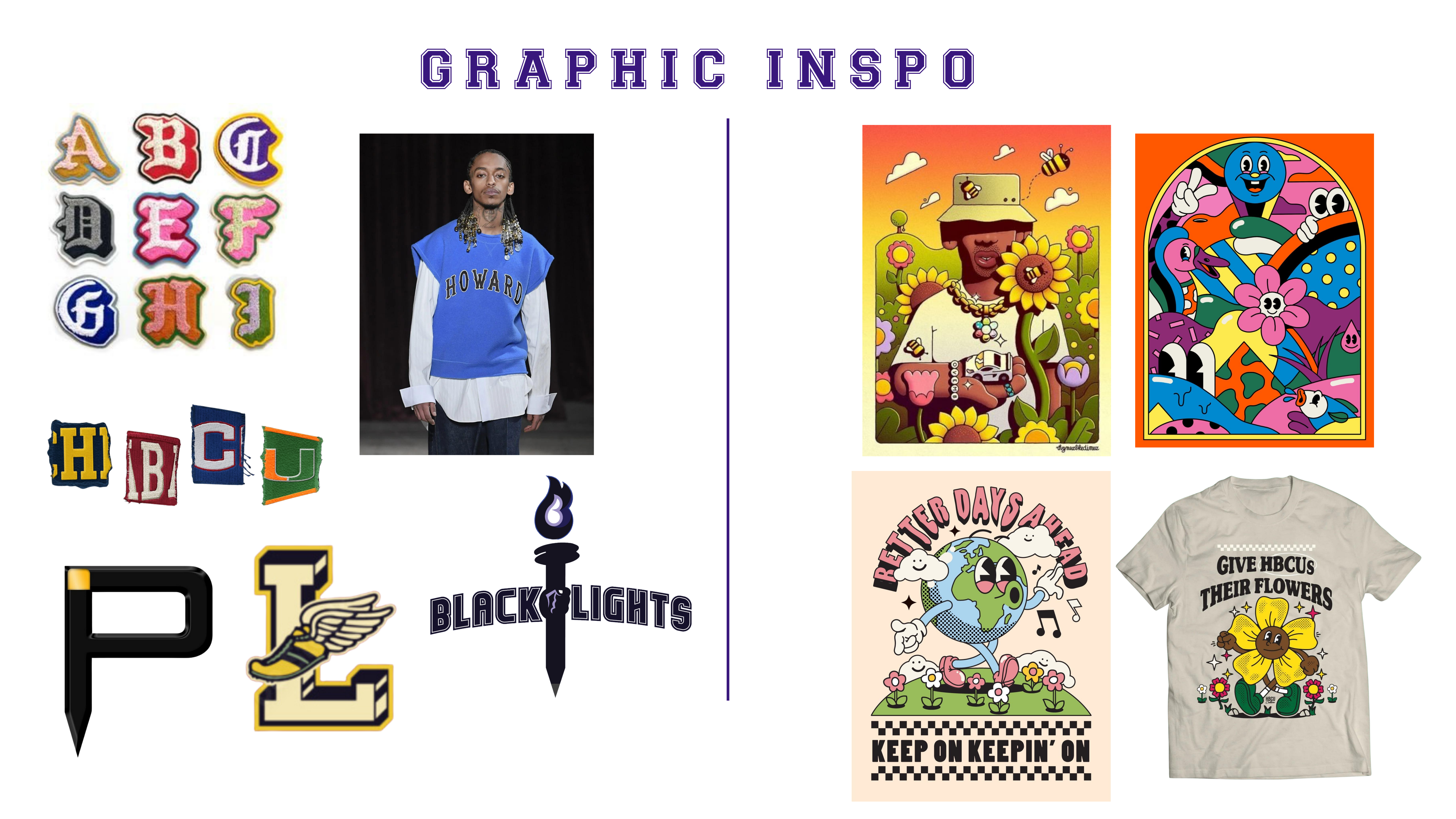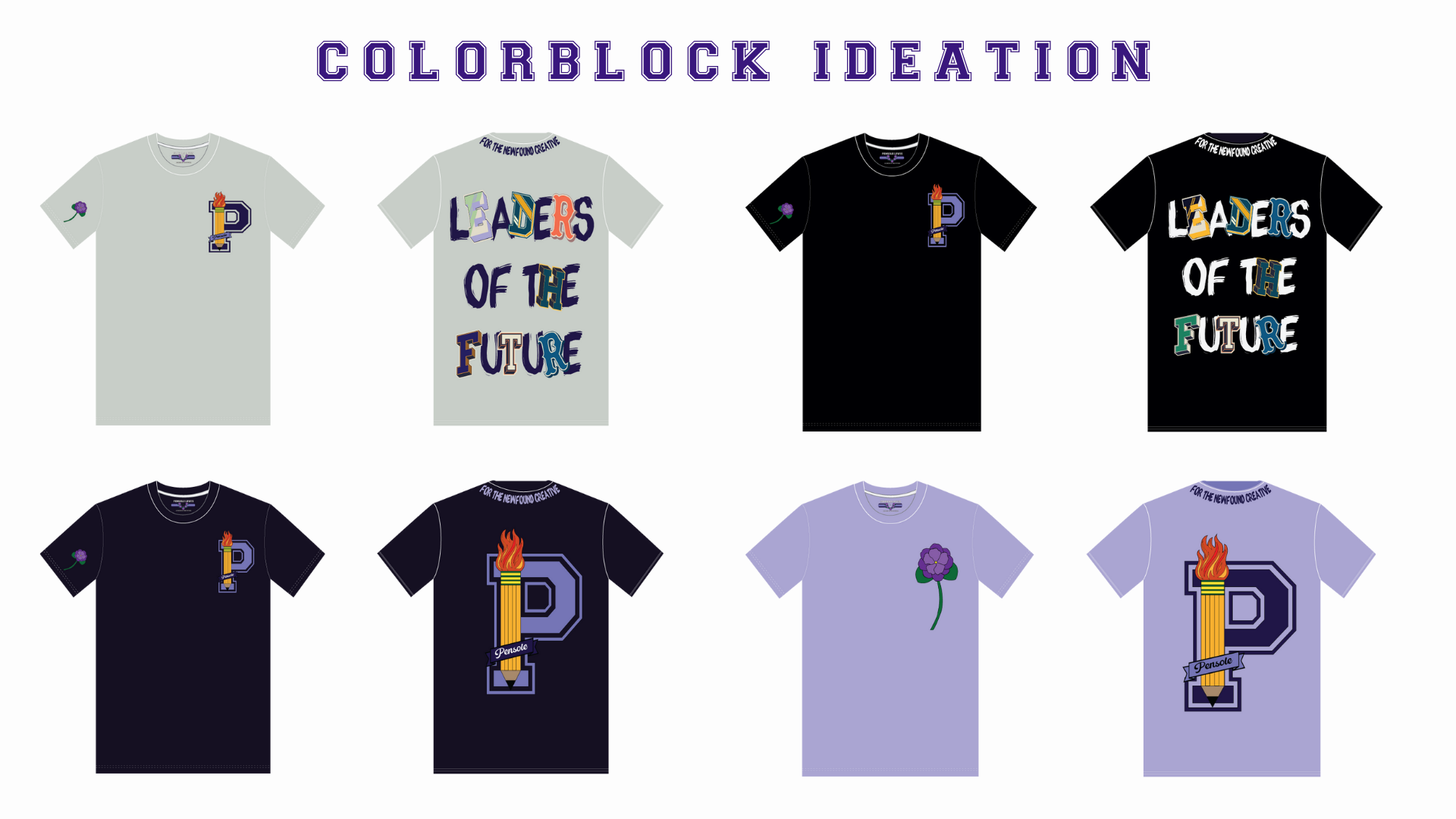 I decided to go with the preppy graphic concept. In doing so, I knew that I wanted to modernize the old Pensole Academy logo, and find a way to incorporate the idea of flames/lights – as an ode to Blacklights and being trailblazers. 1928 and 2024 represent Lewis College of Business and PLC Detroit, violets are in honor of Dr. Violet T. Lewis.